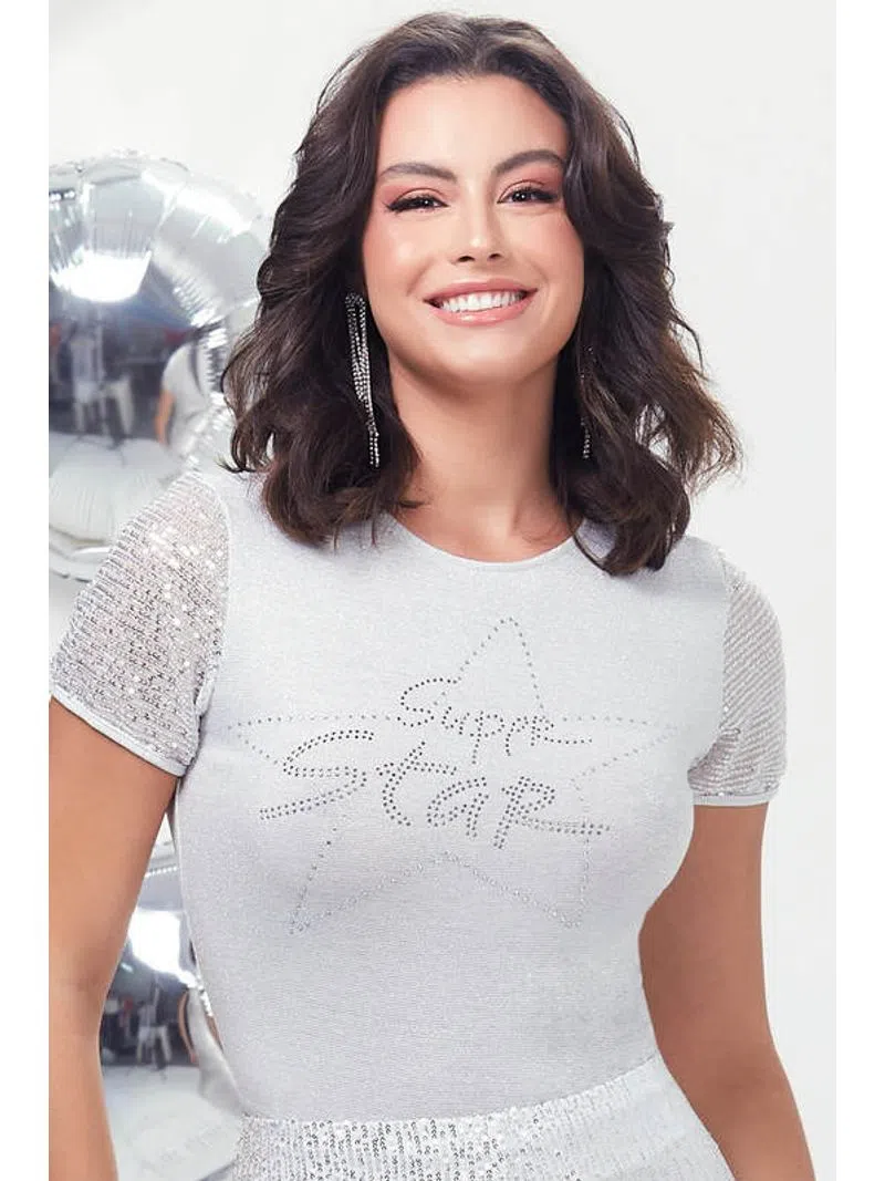BLUSA NA MALHA COM BRILHO ACETINADO, MANGAS DE PAETÊ E LINDO APLIQUE DE STRASS TERMOCOLANTE.